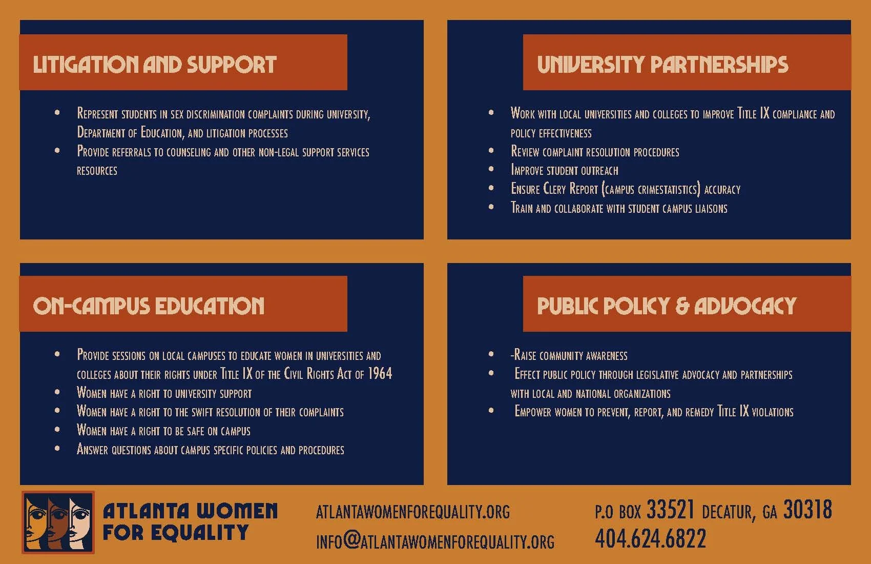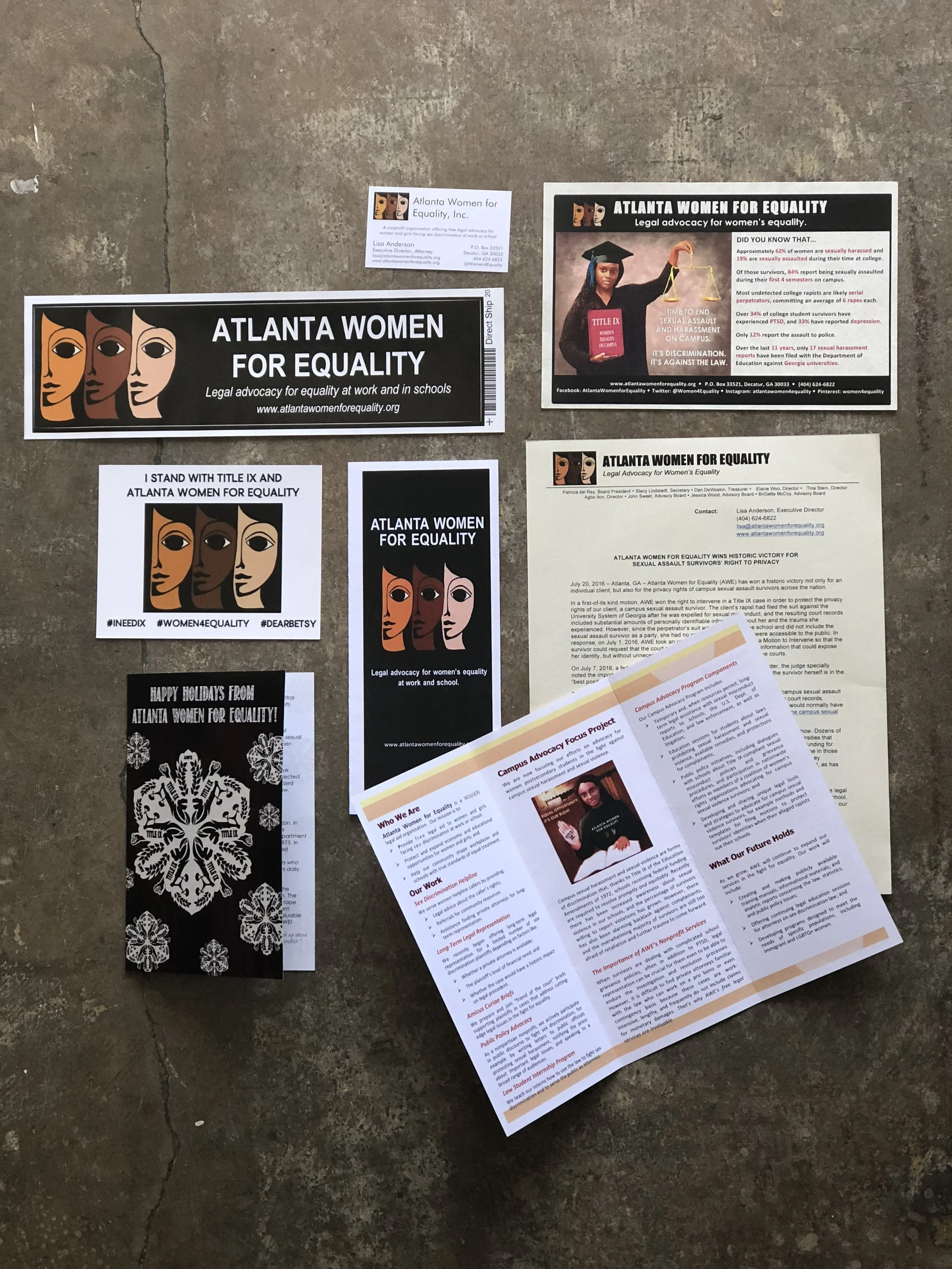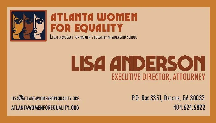 Atlanta Women for Equality, Inc. is a 501(c)(3) nonprofit organization dedicated to providing free legal advocacy for low-income women and girls facing sex discrimination in the workplace or at school, protecting and expanding economic and educational opportunities for women and girls, and helping our community shape our workplaces and schools according to true standards of equal treatment.