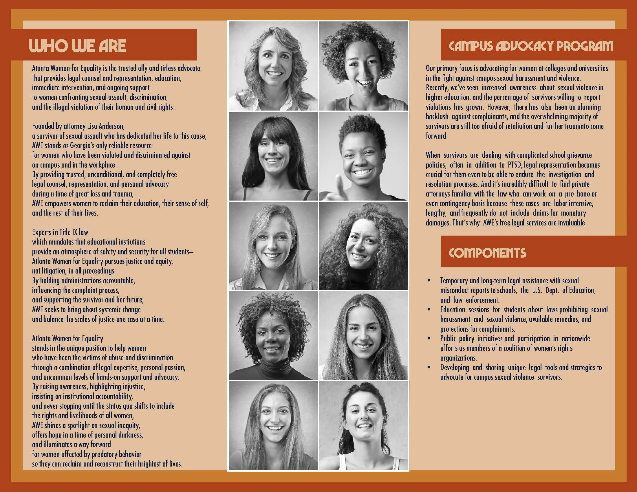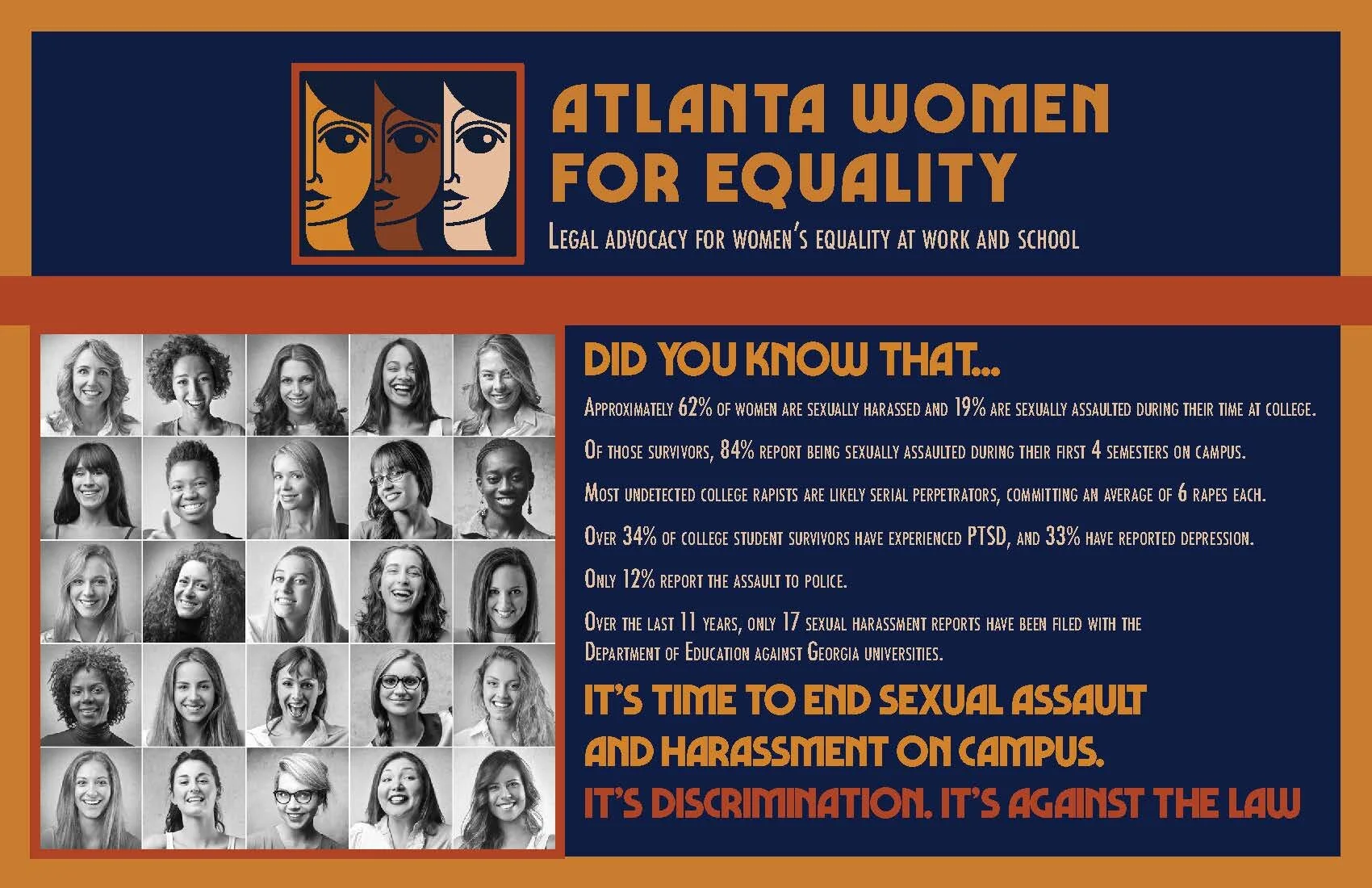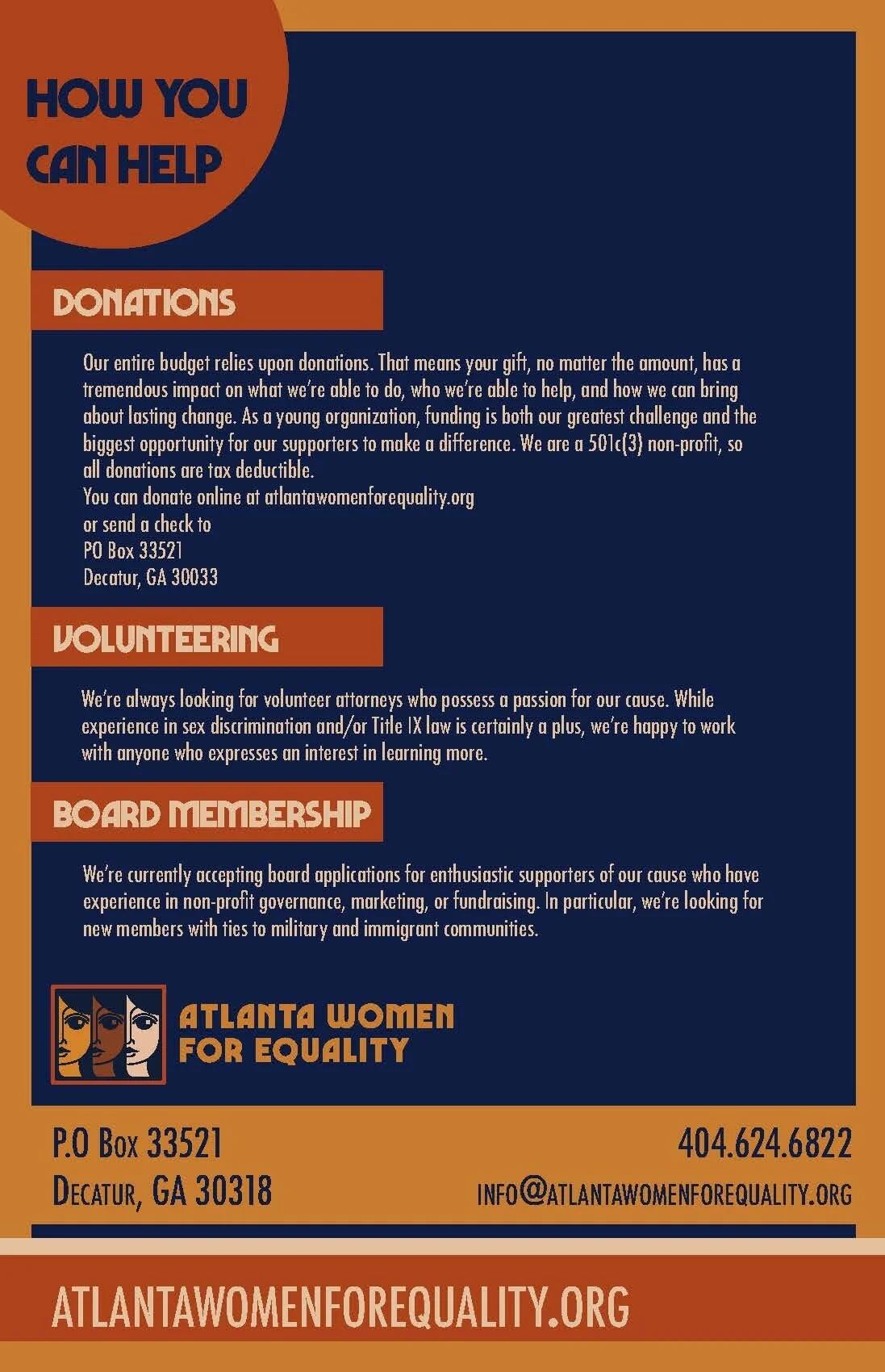 Atlanta Women for Equality, Inc. is a 501(c)(3) nonprofit organization dedicated to providing free legal advocacy for low-income women and girls facing sex discrimination in the workplace or at school, protecting and expanding economic and educational opportunities for women and girls, and helping our community shape our workplaces and schools according to true standards of equal treatment.